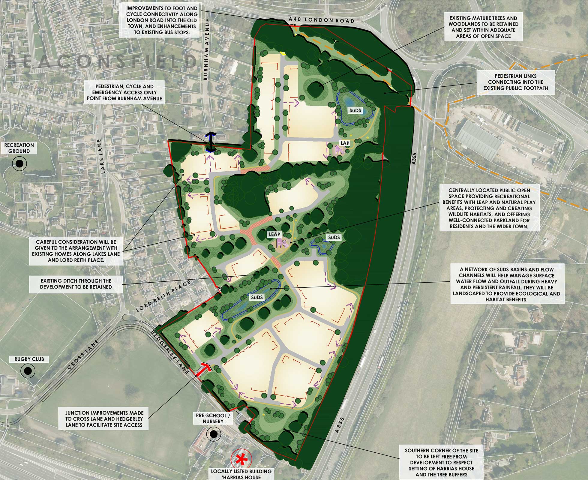 The proposals aim to deliver carefully considered homes and public green spaces, integrated into Beaconsfield’s historic environment.